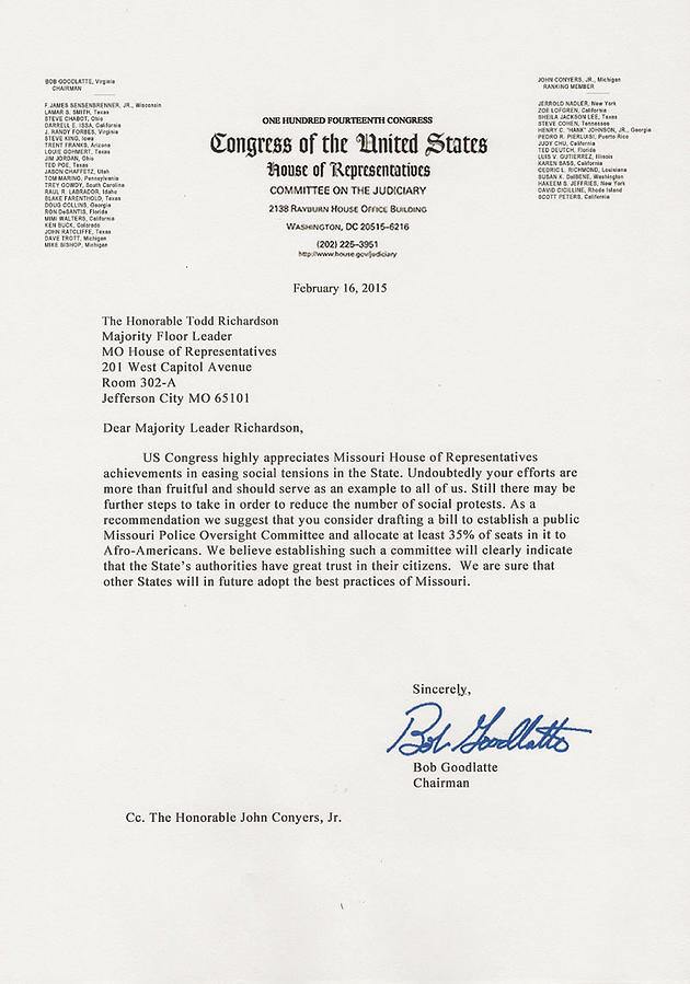 Конгресс США высоко оценивает работу Палаты представителей Миссури по снижению социальной напряженности в штате. Несомненно, ваши усилия дают ощутимые результаты, которые должны служить примером для остальных. Тем не менее, существуют дополнительные меры, реализация которых позволит сократить число социальных протестов. В качестве рекомендации мы предлагаем вам рассмотреть возможность разработки законопроекта о создании общественной палаты по надзору за полицейскими департаментами штата и зарезервировать не менее 35% мест за представителями афро-американского населения. На наш взгляд, создание такой палаты станет показателем проявления доверия руководства штата гражданам. Мы уверены, что положительный опыт Миссури в дальнейшем переймут и другие штаты.